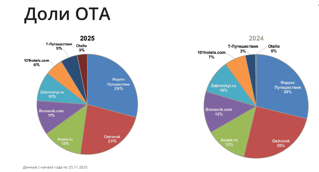 Разумеется, говорили на «ТревелХаб» и о том, как распределяются доли в онлайн-сегменте продаж отелей в 2025 году. Несмотря на прошлые прогнозы, «Яндекс Путешествия» не прибавил ни процента. А те 2%, которые потерял ближайший конкурент экосистемы, сервис бронирования «Островок», похоже, отправились к «Т-Путешествиям», Otello и другим игрокам. Как и 2% Bronevik, на которые уменьшилась его доля за год. Такими данными от Travelline поделился эксперт по цифровым технологиям и управлению ИТ-проектами в гостиничном бизнесе и туризме, автора тг-канала «ПроБизнес» Яков Адамов.