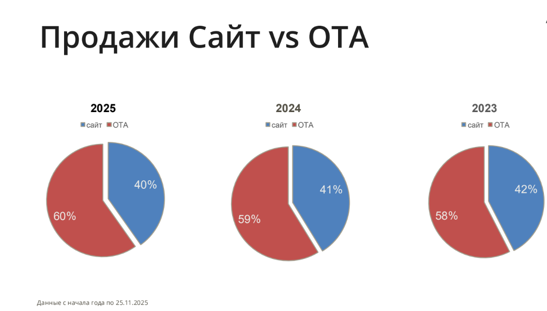 Если судить по данным бронирований отелей за этот год, то ситуация на нем, по сути, стабилизировалась. После значительного скачка в 2022/23 гг. доли прямых бронирований на сайте и через ОТА остаются практически неизменны. Сейчас на долю онлайн-агентств приходится не более 40% продаж.