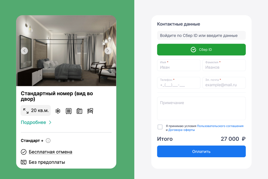 На конверсию напрямую влияет и сам процесс оформления брони. По статистике, более 60% заявок приходит с мобильных устройств. Модуль Bnovo максимально упрощает путь клиента. Например, авторизация через Сбер ID позволяет гостю войти в систему в один клик. В результате модуль бронирования становится каналом продаж с высокой маржинальностью, где отель контролирует и поток заказов, и итоговый доход.