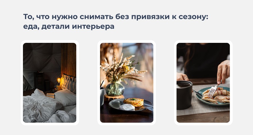 Мы начали составлять техническое задание исходя из того, какие фотографии будут нужны круглый год. Думайте о всесезонности ваших услуг: это могут быть бани и сауны, еда, интерьеры без вида из окна.