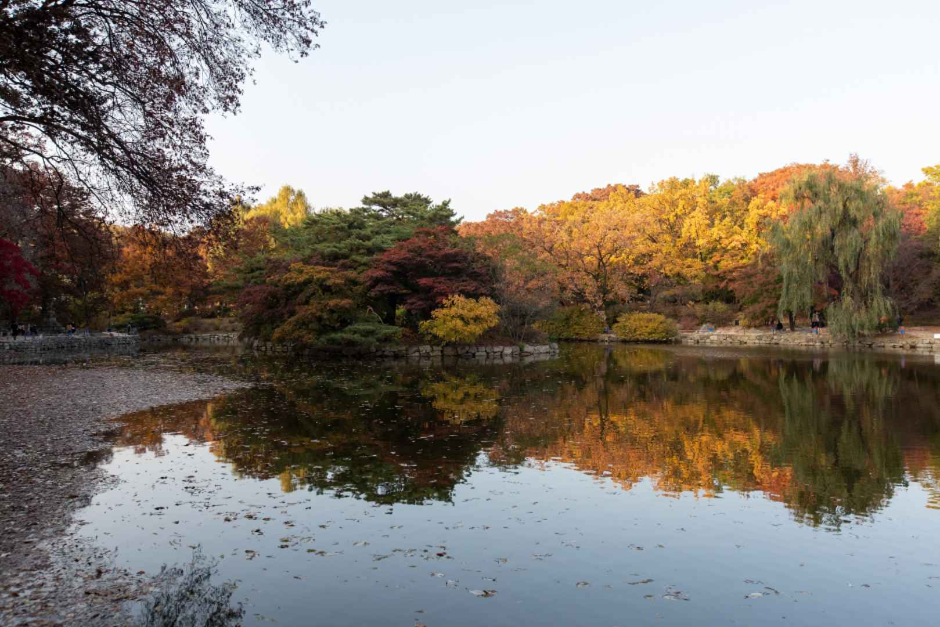 Дворец Чхангдоккун (Changdeokgung) и Секретный сад (Huwon) — ещё одна отличная локация для осенней прогулки. Секретный сад осенью превращается настоящий калейдоскоп красных и золотых оттенков. Особенно живописны пруды, в водах которых отражаются кленовые ветви.