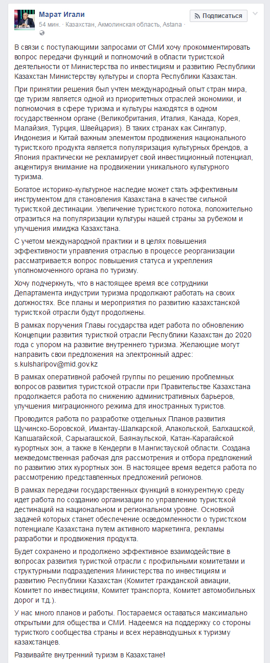 «Сам факт перехода, неважно откуда и куда, это очень плохо, потому что всякий переход состоит из этапов: принятия решения, подготовки, погружения в проблемы отрасли, целеполагания и так далее, которые будут сдерживать развитие отрасли в этот момент. Нам не совсем понятно, зачем нужно было проводить этот переход сейчас, когда мы находимся на пороге ЭКСПО-2017. Ведь основной посыл этого мероприятия — привлечение туристов в страну. Подписаны договоры, меморандумы от имени Министерства по инвестициям и развитию, проводится работа по продвижению. Кроме того, нынешнее отраслевое министерство было для развития туризма серьезным подспорьем — занималось развитием инфраструктуры, то есть самым дорогостоящим компонентом турпродукта. Без инфраструктуры нельзя говорить о серьезном развитии туризма. Например, строительство дороги Западная Европа — Западный Китай, которая должна стать частью Великого шелкового пути.