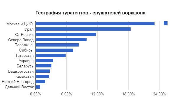 Широта охвата аудитории — экспоненты на 2 недели получили пристальное внимание турагентов столицы и регионов России, а также Беларуси, Казахстана, Украины. Воркшоп дал возможность увеличить количество партнеров и установить с ними контакты, обучить их и простимулировать продажи своих предложений по направлению. И все это — в онлайне, не выходя из офиса, а значит — никаких командировок и чемоданов с каталогами!