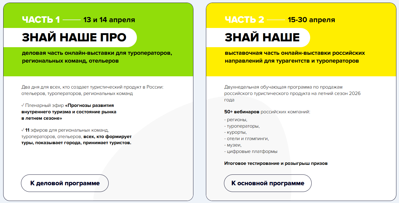 Выставочная часть «Знай Наше: Лето 2026» с 15 по 30 апреля — территория турагентов: двухнедельная обучающая программа по продажам на лето-2026 и 60+ вебинаров от отечественных компаний. Себя представят регионы, туроператоры, курорты, отели и глэмпинги, музеи, цифровые платформы — вся цепочка, из которой каждый агент легко соберет свое «лето в России». Расписание составлено так, чтобы учиться, не выпадая из рабочего ритма: презентаций не больше 3–4 часов в день.