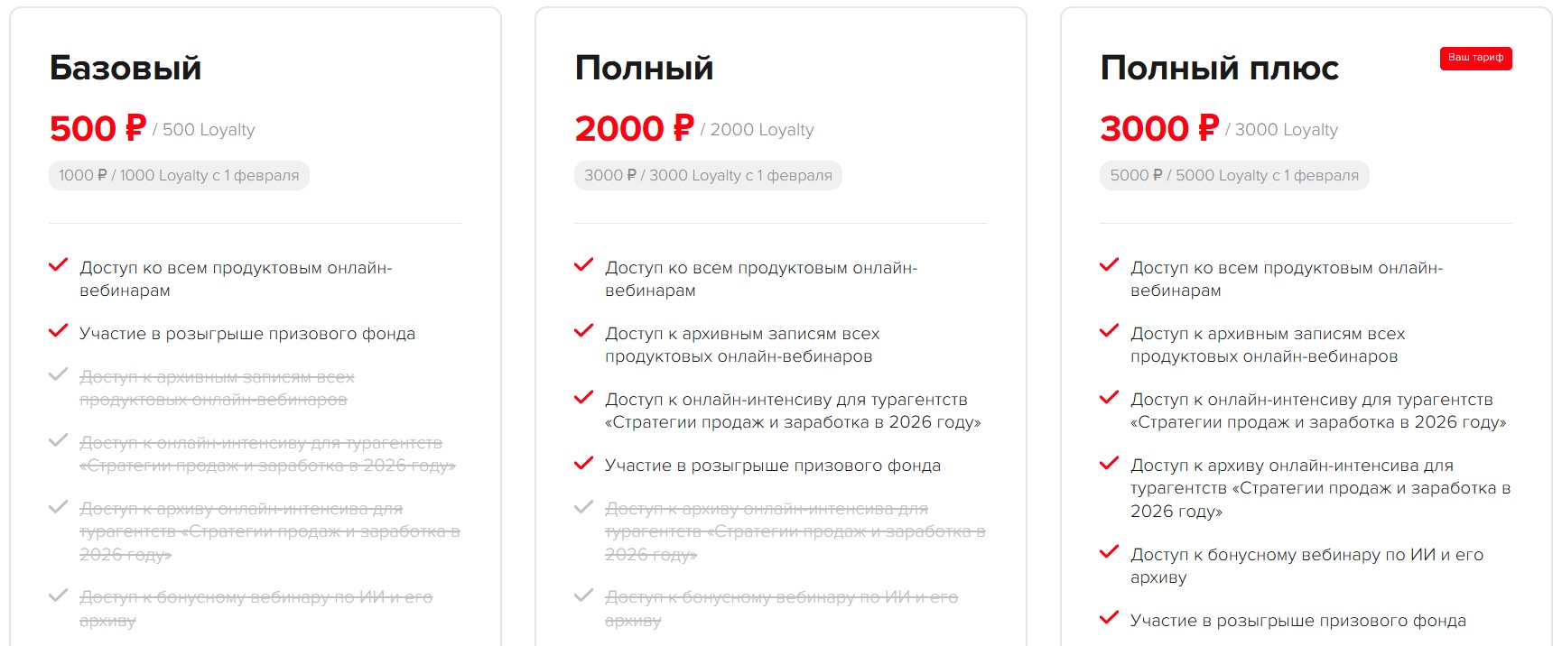 Если важен только турпродукт и участие в розыгрыше одного приза — хватит «Базового» тарифа. Если важно сформировать стратегию, «прокачать» продажи и претендовать уже на несколько призов — выбираем тариф «Полный». «Полный плюс» подойдёт тем, кто планирует возвращаться к материалам, активно использовать ИИ и получать максимум пользы от всех активностей OTM. Цены раннего бронирования 500 / 2000 / 3000 ₽ действуют до 1 февраля и позволяют зайти в программу по минимальной стоимости. Напомним, что первый стартовый эфир по стратегиям продаж в турбизнесе будет бесплатным и доступным для всех.