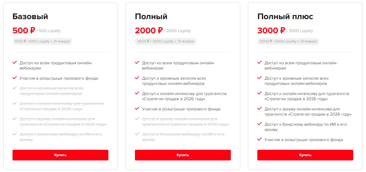 Если важен только турпродукт и участие в розыгрыше одного приза — хватит «Базового» тарифа. Если важно сформировать стратегию, «прокачать» продажи и претендовать уже на несколько призов — выбираем тариф «Полный». «Полный плюс» подойдёт тем, кто планирует возвращаться к материалам, активно использовать ИИ и получать максимум пользы от всех активностей OTM. Цены раннего бронирования 500 / 2000 / 3000 ₽ действуют до 31 января и позволяют зайти в программу по минимальной стоимости. Напомним, что первый стартовый эфир по стратегиям продаж в турбизнесе будет бесплатным и доступным для всех.