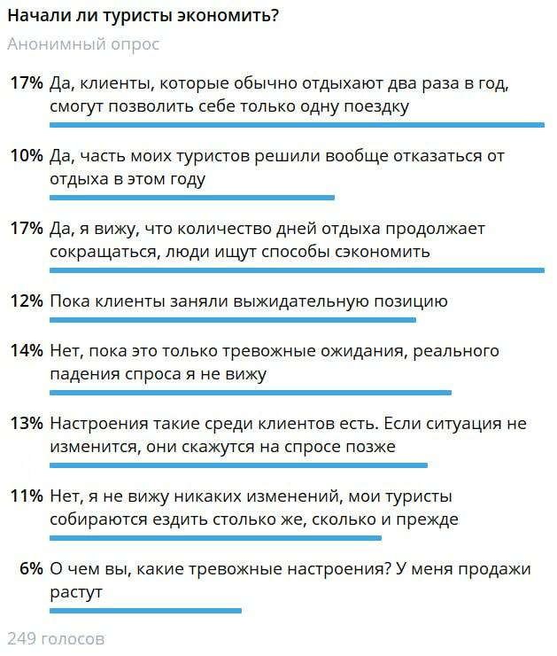 На туристическом рынке отмечают, что туристы экономят на поездках все больше. Это показал опрос турагентов в канале Profi.Travel. Одна из главных причин — падение реальных доходов населения и одновременно рост расходов. Из-за этого, например, массово разоряются рестораны — только в январе в Москве закрылось 45 популярных заведений, а по итогам года эксперты ждут ухода с рынка более 460 — это больше, чем в пандемию. Эксперты не исключают, что вскоре эта тенденция может сказаться и на туризме: клиенты турфирм начнут не только уменьшать количество дней отдыха, но и отказываться от дополнительных поездок, которые могли позволить себе раньше.