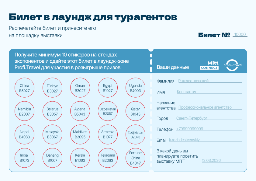 В самые интенсивные дни выставки — 11 и 12 марта — агенты смогут прийти в лаунж в конце иностранного зала (стенд В2101). Profi.Travel и MITT Connect создали это пространство, чтобы посетители могли оставить свои вещи под присмотром, зарядить телефоны, спокойно ответить своим туристам, попить воды или кофе, и просто посидеть и пообщаться. Команда Profi.Travel будет рада увидеться с читателями — с кем-то впервые, а с кем-то как давние знакомые. Здесь же будут разыграны призы среди агентов.