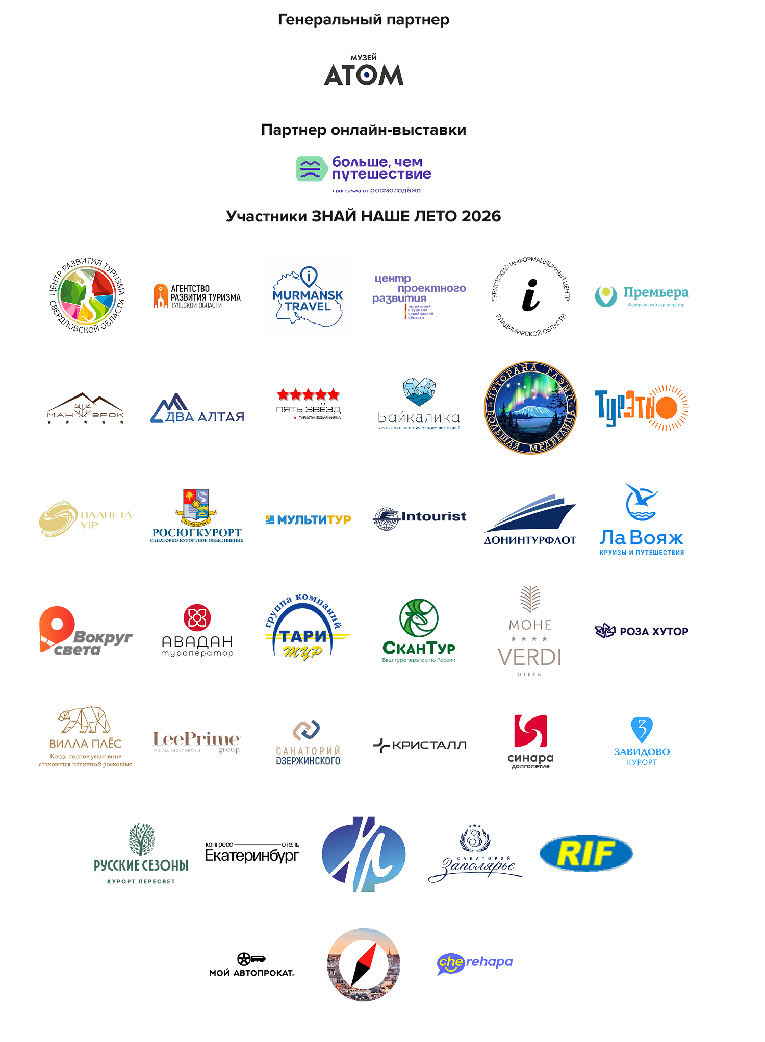 Туроператоры: «Мультитур», «Росюгкурорт», «СканТур», «Планета Сочи», «Премьера Тур», «Тари Тур», «Тур Этно», «Два Алтая», Mantera Travel, «Путорана Глэмп», «Байкалика», «Авадан», «География»
