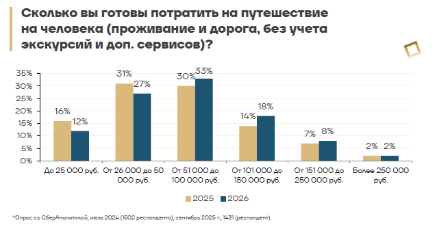 И тратить на свои поездки российские туристы тоже планируют больше, чем в прошлом году. Согласно опросу, стало меньше тех, кто закладывает на отдых до 50 тыс. рублей, и больше — тех, кто планирует расстаться с большей суммой. Наиболее заметный рост — плюс 4% — среди туристов, кто собирается потратить на поездку от 100 до 150 тыс. рублей.