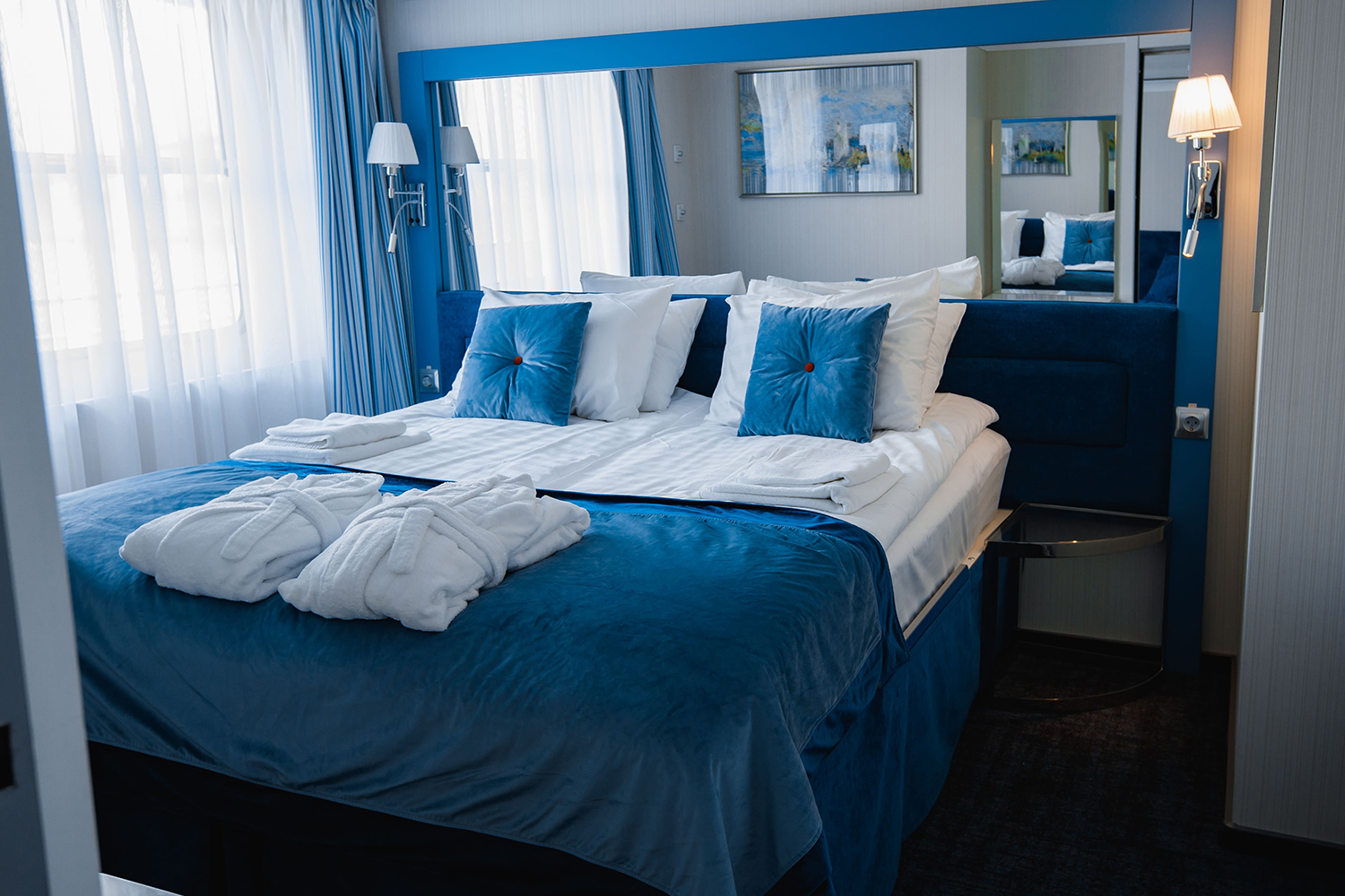 Гостей ждёт уютная мягкая мебель, гобелен в отделке, резные потолки и мягкие пыльно-розовые тона. Условия проживания и обслуживания на судне соответствуют уровню отеля 5*.